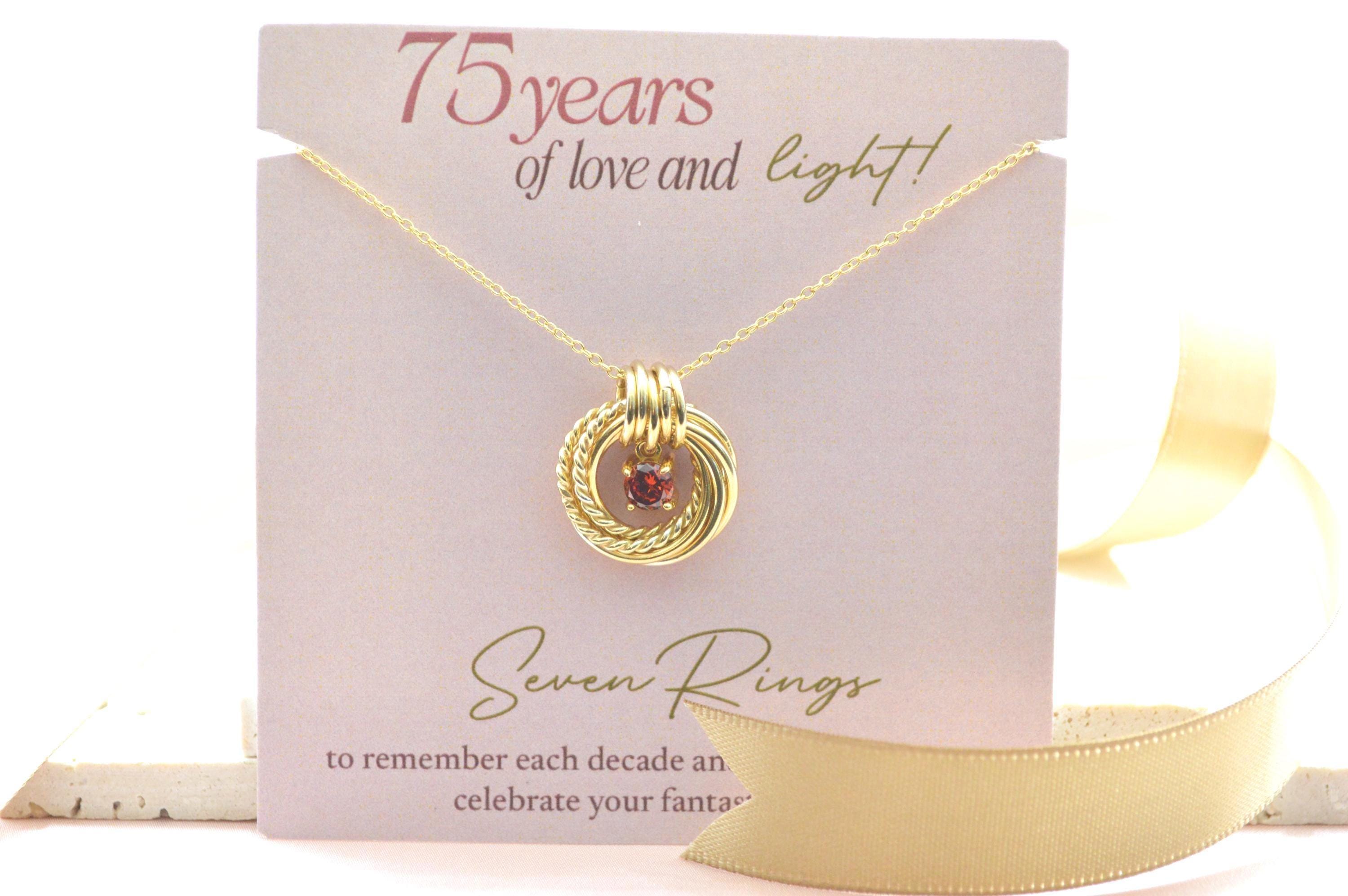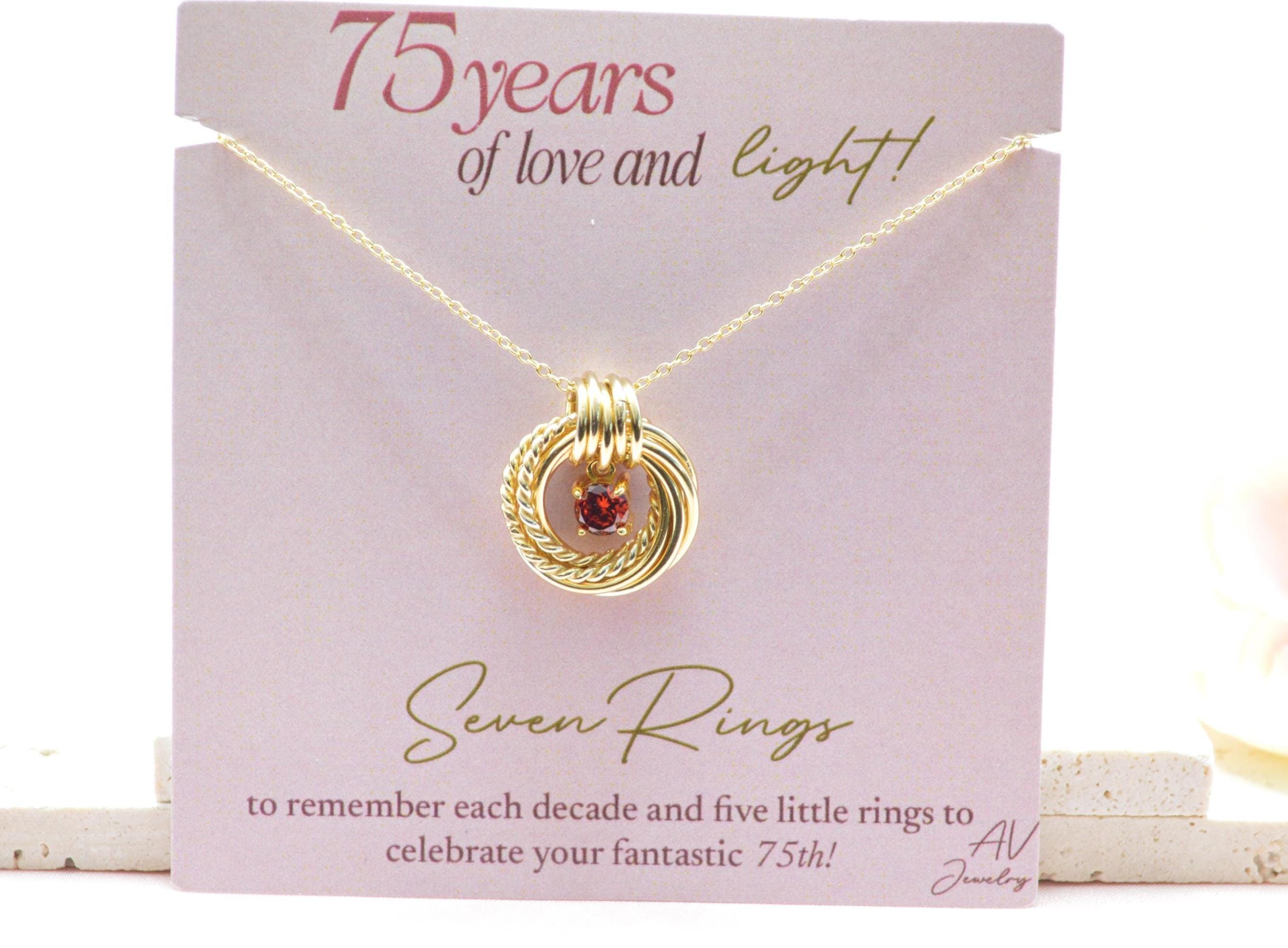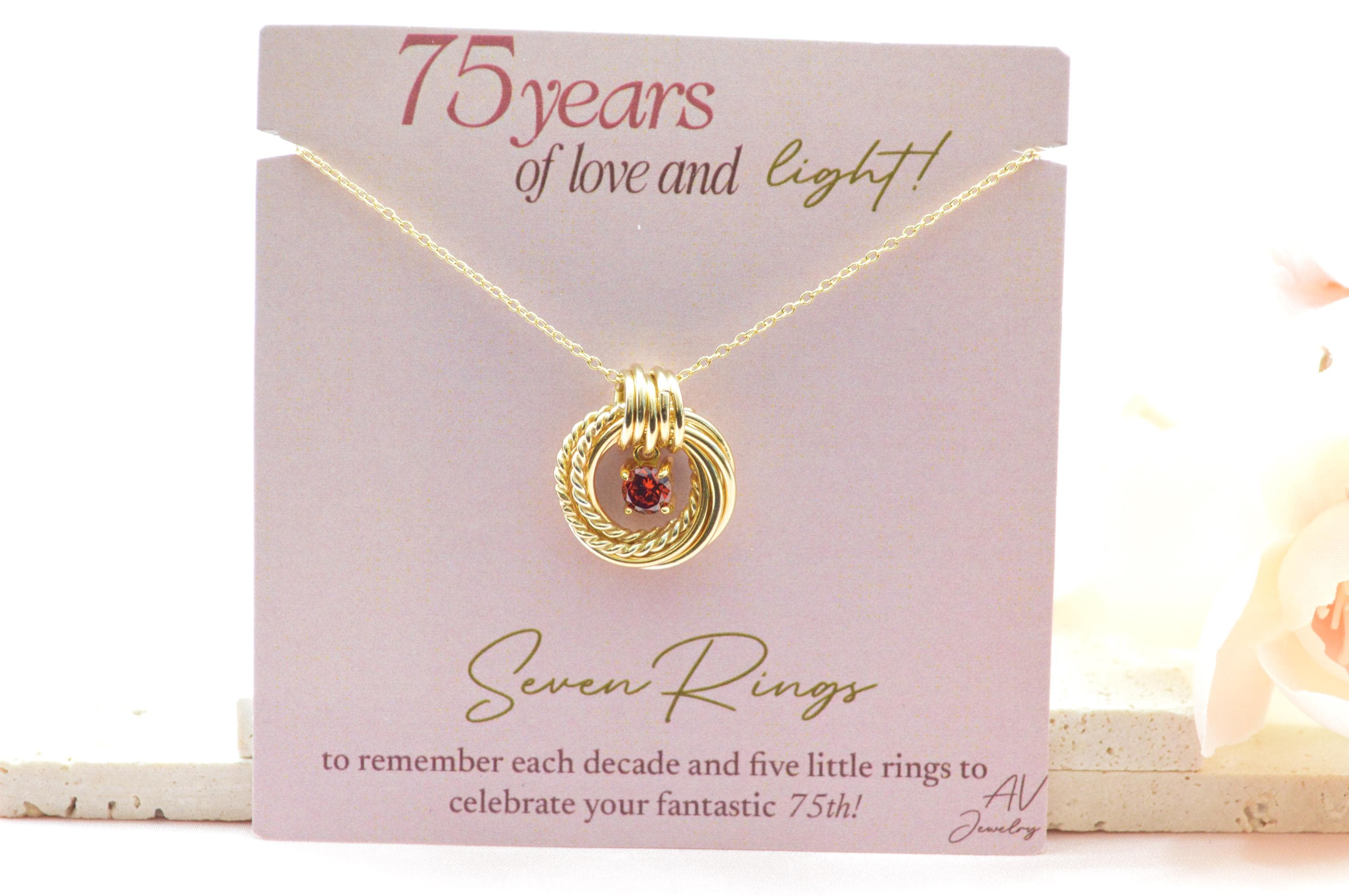 Seven beautiful gold vermeil rings symbolizing each decade's richness, and five precious circles on top commemorate your magnificent seven-fifth milestone. The rings are 0.6 inches (1.5 cm) in diameter.